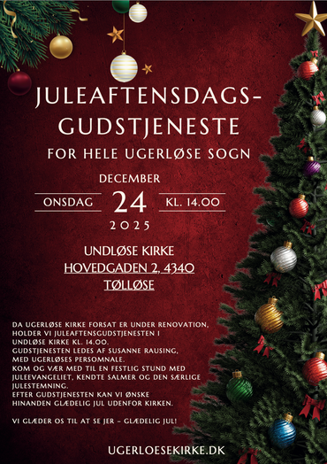 Da Ugerløse Kirke stadig er under renovation, holder vi årets juleaftensgudstjeneste d. 24/12 i Undløse Kirke kl. 14.00. En særlig gudstjeneste for alle i Ugerløse sogn.